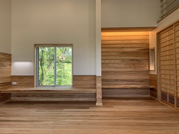 宮崎県産杉材をふんだんに使うことにより、自然に優しく包み込まれた空間、安心感、開放感、を実現。